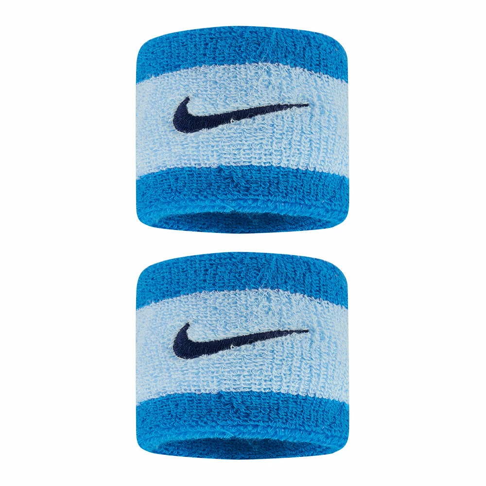 The Nike singlewide wristband is 2.5 inches and made from absorbent cotton/nylon/spandex blend with an embroidered Nike Swoosh. 2 per pack.